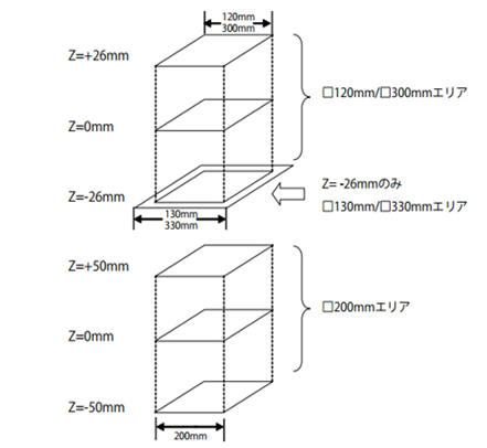 ※1 120mmおよび300mmのマーキングエリアは、Z=-26mmでは□130mmまたは□330mmとなります(下図参照)。